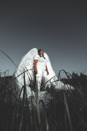 A woman in white clothing and large white wings stands in a field of tall grass, evoking a sense of unearthly beauty and spiritual symbolism against a dark sky. Angel in the Field.