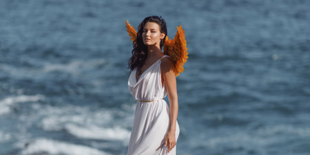 Portrait of beautiful brunette woman with angels wings. Angel with long curly hair.