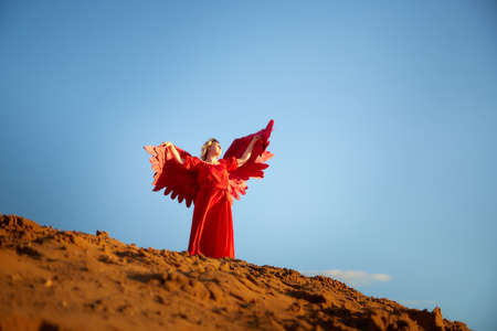 Plump middle-aged woman with red angle wings in a desert with dunes and sand in nice summer or spring sunny day with blue sky