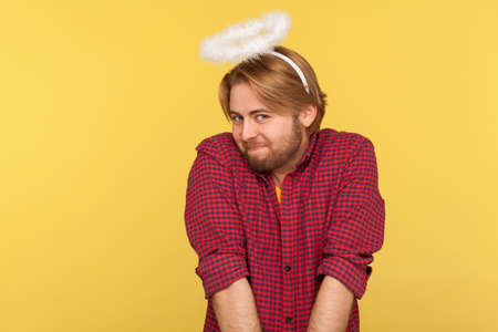 The male guardian angel looks with calm and hope in his eyes. Full-length studio portrait with white background.