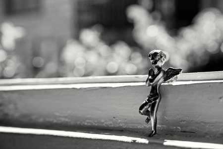 Beautiful cupid angel white porcelain figurine on wooden board on natural background
