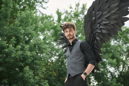 A handsome black angel stands on the street against the backdrop of trees and calmly looks into the camera. Concept of war and peace, doomsday, apocalypse. Place for text.