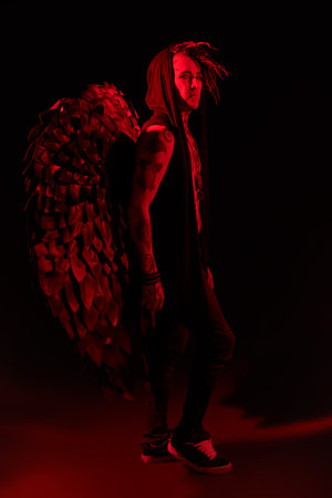 An artistic rock musician dressed as a fallen black angel stands in the red light. Full-length portrait.