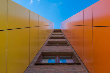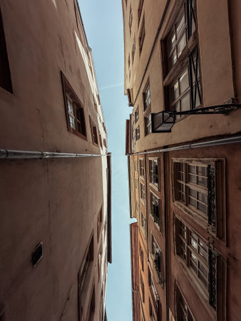 Corners of two buildings built very close to each other,Bottom view. Passage between houses. Urban architecture.