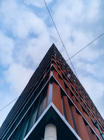 Lodz, Poland - February 21 2020 Facade of high corporate building with windows and brown metal panels