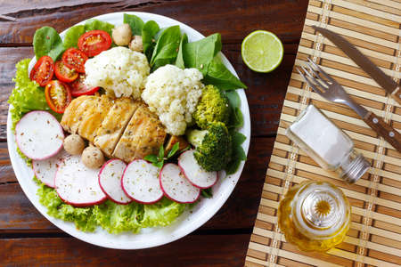 Chicken breast with fresh vegetable salad. Healthy diet menu. Top view, flat lay