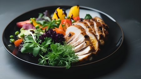 Grilled chicken breast with fresh vegetable salad on black plate over dark background