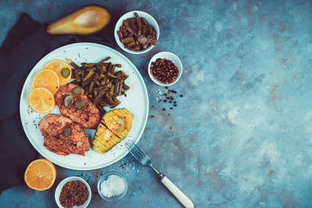 Grilled chicken breast fillet with roasted vegetables. concept healthy food. flat lay.