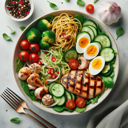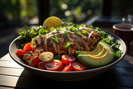Superior view of healthy diet salad with grilled chicken broccoli cauliflower toma, generative AI