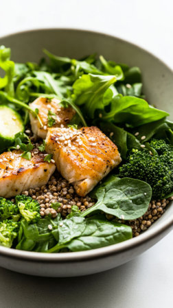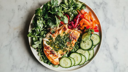 A visually appealing salad bowl featuring grilled fish on a bed of fresh greens, accompanied by vibrant slices of cucumber and colorful peppers. Perfect for healthy eating.
