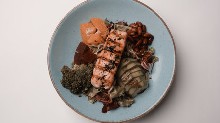 Grilled salmon fillet accompanied by fresh vegetables, herbs, and bread on a bright surface highlighting a healthy eating lifestyle