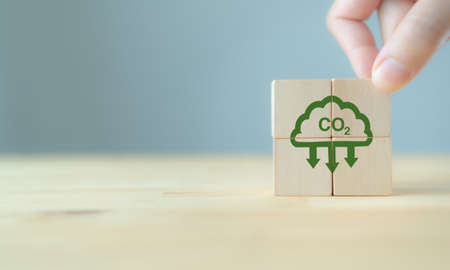 CO2 emission concept. Green industries business concept. Net zero emissions. Renewable energy, sustainable technology, ecology solutions. Hand puts the wooden cubes with CO2 emission reduction icon.