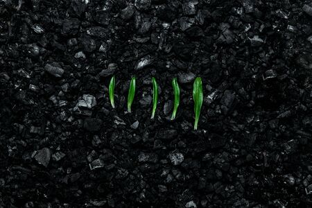Nature concept, Frame of green twigs and leaves on a dark coal background. Environmental pollution, coal mining, clean air, clean energy source