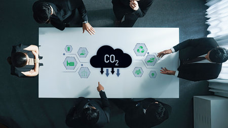 A business meeting focused on carbon dioxide reduction strategies and innovative green technologies to promote sustainability and environmental impact in various industries.