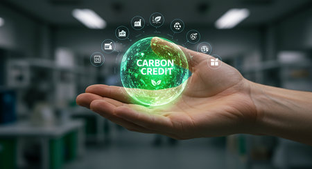 A hand holds a glowing orb displaying Carbon Credit surrounded by environmental icons, symbolizing sustainable finance and environmental responsibility in a modern industrial setting.