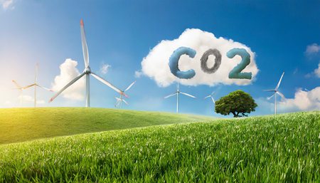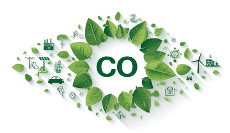 An illustration depicts the concept of carbon emissions surrounded by fresh green leaves. The composition showcases various environmental symbols, including solar panels, wind turbines, and industrial plants. The image has a clean, graphic style with bright colors and a white background suitable for various commercial or editorial applications.