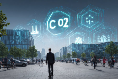 A man in a suit walks towards an illuminated graphic representation of carbon emissions and other related elements in a contemporary urban environment. The image displays a stylized composition with digital visual effects. The scene showcases vibrant colors, conceptual content, and a commercial aesthetic. It can be used for informational, educational, and promotional purposes.