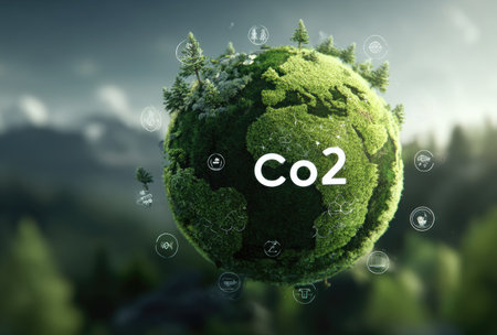 A digital illustration depicts a spherical landmass covered in green foliage and trees, with the word CO2 prominently displayed. The composition features a natural aesthetic with soft lighting and a blurred background, set within a natural environment. Conceptual elements and icons suggest environmental themes, ideal for various commercial uses.