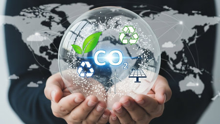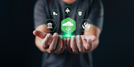 A person holds out their hands beneath glowing eco icons and a green CO2 cloud symbol, representing environmental sustainability, carbon reduction, and clean energy initiatives.