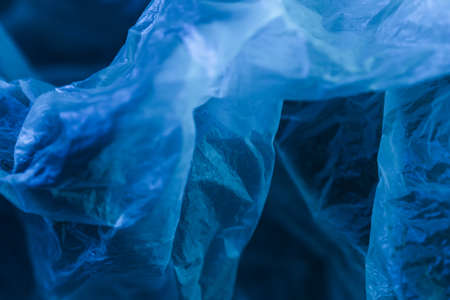 Plastic pollution. Waste management. Environmental protection. Blue creased texture polyethylene film cellophane bag collection on blur dark abstract background.