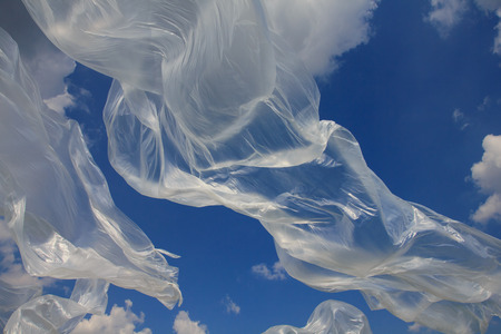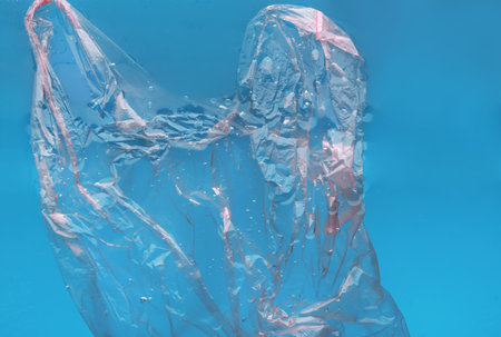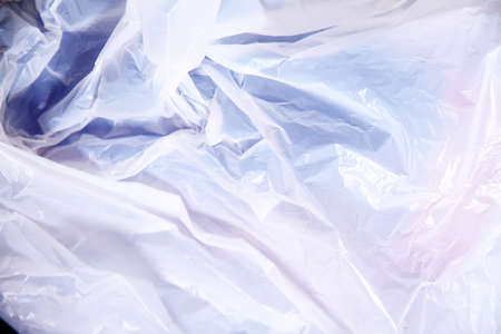 White and blue plastic background, wrinkled single use bag. Concepts: sustainability, recycling, pollution.