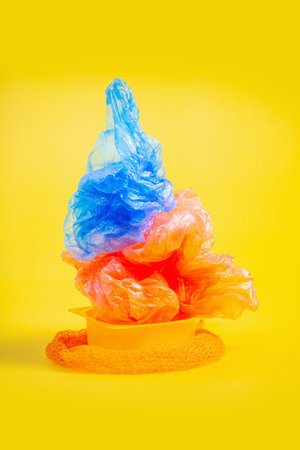 Plastic pollution. Soil contamination. Nature conservation. Ecology problem. Transparent wrinkled cellophane bag collection polyethylene film in blue orange color light abstract background.