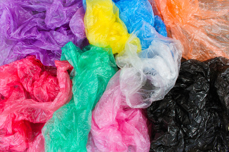 Many disposable plastic bags texture background. Zero waste shopping. Sustainable living, plastic free concept. Eco friendly plastic free items. Top view. Copy space.