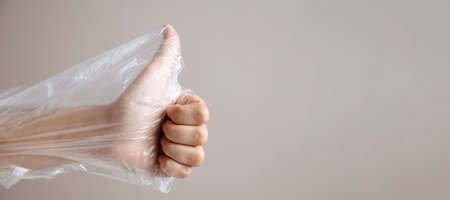 Waste collection. Plastic pollution. Garbage management. Ecology problem. Volunteer hand in blue glove holding empty used cellophane bag isolated on dark copy space background.
