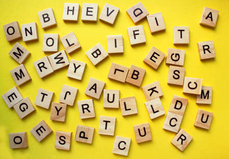 English alphabet. The letters are arranged chaotically on a yellow background. View from above. Words. Toy bricks on a yellow background. English language. Grammar.