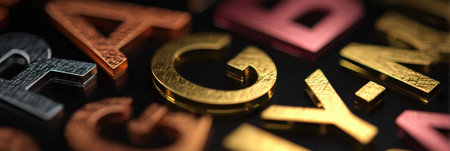 Various colorful metallic alphabet letters are scattered on a dark surface, highlighting their unique textures and shades, perfect for design inspiration.