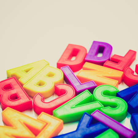 Vintage looking English alphabet letters in plastic toy characters