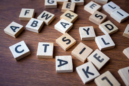 Text dice cube concept / Letter dices alphabet on wooden background. Block of alphabet studded on the floor.