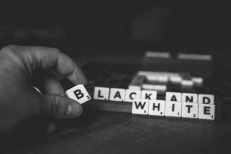 Brecht, Belgium - 28 July 2020: A black and white portrait of a hand of a person holding the letter b in between the fingers in front of a scrabble board with the words black and white on them.