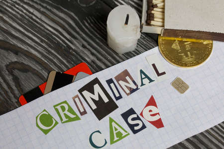 The phrase Criminal case made of letters cut from a magazine and pasted on a sheet of paper. Bank cards, a bitcoin coin stick out from under the paper. There is a candle stub. On brushed pine boards painted black and white.