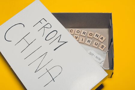 coronavirus disease in box from handwriting 2019-nCoV on paper, breathing mask and thermometer.