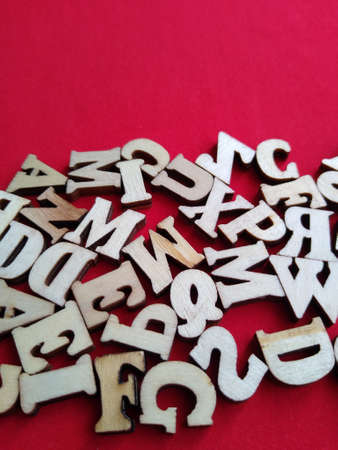 wooden letters of the alphabet scattered on a red background with space for text. High quality photo