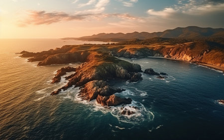 Hills on ocean shore in gold hour sunset light aerial view