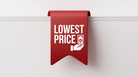 Red ribbon tag with text LOWEST PRICE and a white icon of a hand holding money Clear details and vibrant color...