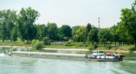 A tanker in motion on the Danube River in the city of Novi Sad.