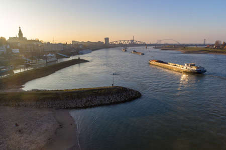 Nijmegen, the Netherlands - November 16 2018: cargo river barges passing near Nijmegen during time of low river levels
