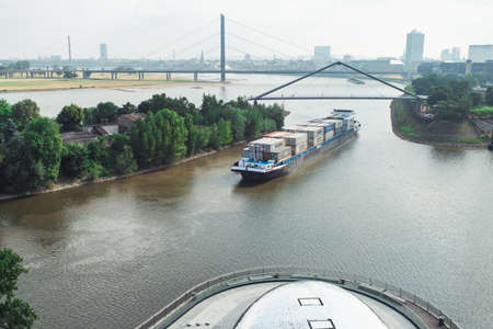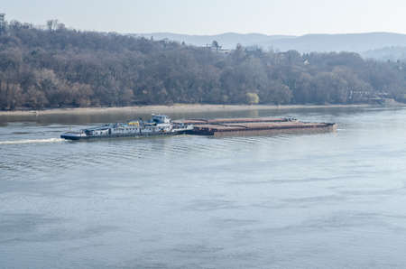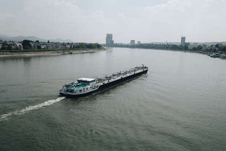 Königswinter, Germany - May 7, 2022: Shipping. Cargo barge. Magnificent panoramic view of the Rhine valley. A beautiful landscape on a navigable river in Germany