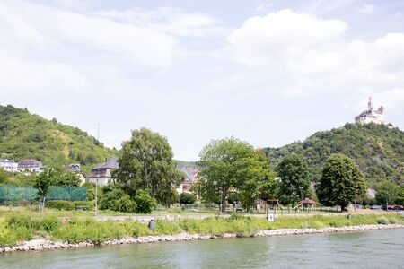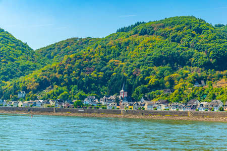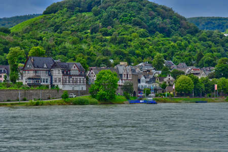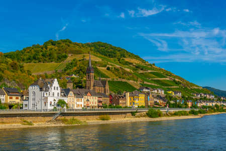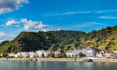 Sankt Goarshausen, Germany - August 11, 2018: Sankt Goarshausen Town on Rhine River, romantic Rhine valley landscape at beautiful summer day in Germany.