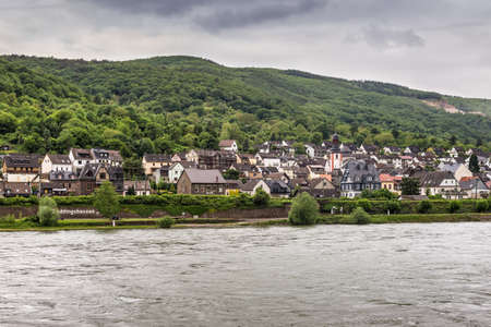 Trechtingshausen, Germany - May 23, 2016: Trechtingshausen village in the Unesco World Heritage area of the Rhine Valley in cloudy weather at the Mainz-Bingen district in Rhineland-Palatinate, Germany.