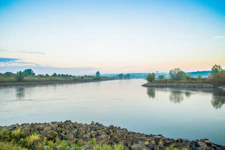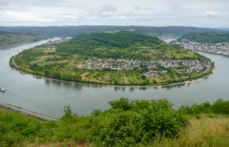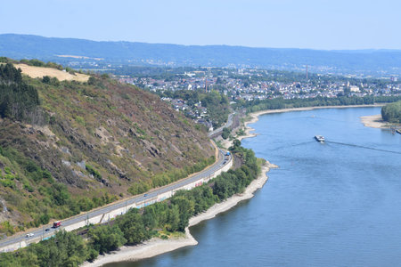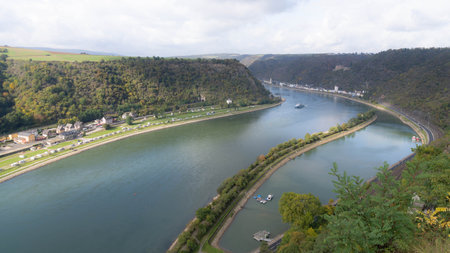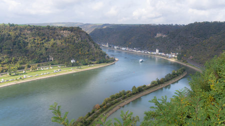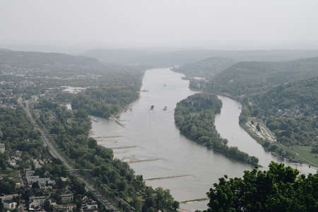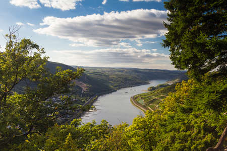 Magnificent panoramic view of the Rhine valley. A beautiful landscape on a navigable river in Germany