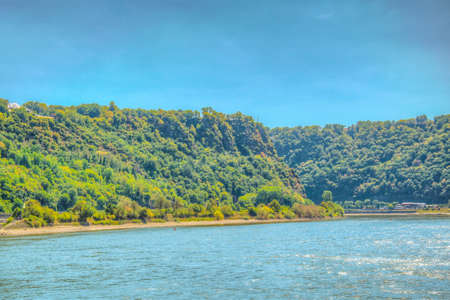 The river Rhine in western Germany flows between the hills covered with forest, visible buildings and a rock cliff.