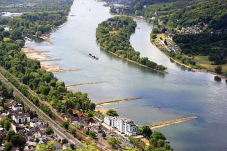 Panarama view from the Drachenfels to the river Rhine and view of Nonnenwerth Island. Bad Honnef near Bonn, Germany.