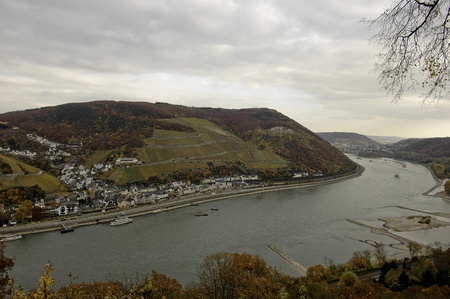 Beautiful German landscape with tiered vineyard and village seen from the middle Rhine River.