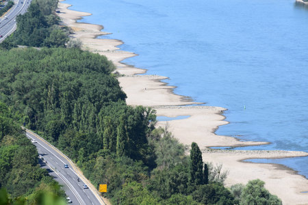 Drought in Germany, low water of the Rhine river in andernach near koblenz influending water transport freight ships