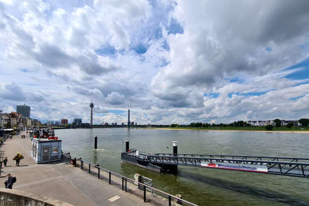 Rhine river boardwalk with view on Dusseldorf city in Germany