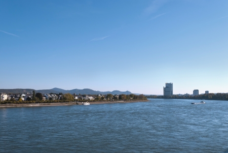 Bonn in the Rhine valley with a village and a container ship on the Rhine